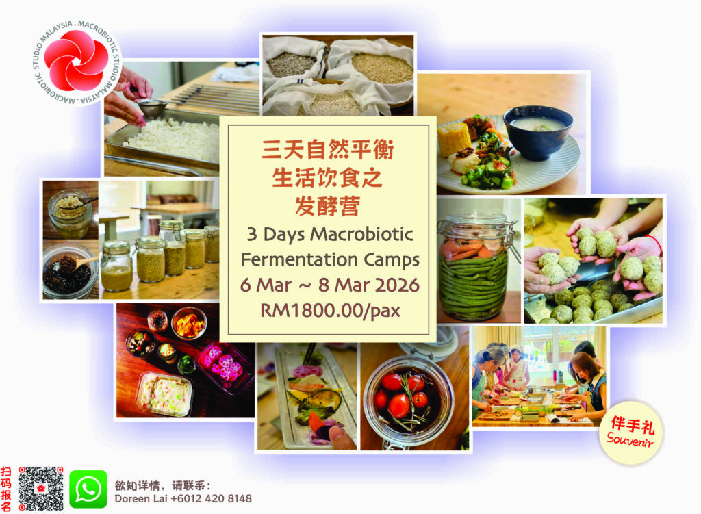 ACTIVITIES ~ 2026 ~ ~ 2025 ~ 2025 MSM Macrobiotics 系列活动,工作坊和课程 第4季~9月份至12月份 让我们来陪伴你共同携手共创美好人生另外也有为新手父母特别安排的工作坊,建立健康快乐幸福的家庭 及 2025年的 Level 1 & Level 2. 现在开始公佈和招生 有兴趣的朋友,现在开始,可以为你今年的最后一季规划自己人生健康稳定平衡的基础。 请WhatsApp联系:012-4208148 🌿 《疗愈之旅:重启健康 之道生活营》原来甩掉慢性疾病,不管是高血压,糖尿病,胆固醇,或是尿酸等疾病,是真的有方法的?!你是否……🔹 长期被疲倦、亚健康或慢性问题困扰?🔹 想找到真正能带来身心转化的方法?🔹 希望通过饮食与生活方式,重拾活力与平衡?想要从饮食和生活方式,就可让自己少看医生,少用药的,由国际资深宏观饮食导师 Patricio Garcia de Paredes亲自授课。📍 槟城·大山脚(Macrobiotic Studio Malaysia)日期:08 – 10/8/2025 【免费预览讲座】以食为药 · 缓解便秘 · 重建肠道健康 线下活动:日期:2025年5月14日(星期三)时间:上午10点 至 中午12点地点:Macrobiotic Studio Malaysia(MSM)Bukit Mertajam, Pulau Pinang 线上活动:日期:2025年5月16日(星期五)| 时间:晚上8点 至 10点 六大讲座亮点 食物就是最好的药 | 阴阳属性与实用食材选择 正食饮食一阶课程内容概览 | 讲师现场答疑互动 小班制温馨讲座,名额有限 | 可预订润肠能量午餐,RM35 到场好礼: 一杯温润养肠的天然润便茶 肠道调理饮食讲义一份 报名方式 Doreen Lai – 012-420 8148 ~ 2024 ~ 2024年10月份的活动系列 时间:早上9am-下午4pm地点:槟城大山脚 Macrobiotic Studio Malaysia 更多详情,欢迎Whatsapp:Allisia 012-4166845 2024年9月份的活动系列 *学费已包括食材,纯素午餐,食谱时间:早上9am-下午4pm地点:槟城大山脚 Macrobiotic Studio Malaysia更多详情,欢迎Whatsapp:Allisia 012-4166845 2024年8月份的活动系列 *学费已包括食材,纯素午餐,食谱时间:早上9am-下午4pm地点:槟城大山脚 Macrobiotic Studio Malaysia更多详情,欢迎Whatsapp:Allisia 012-4166845 2024年《Macrobiotic 一日烹饪体验课》你准备好了吗?让我们一起经历一次有趣、健康与充满能量的真食生活烹饪体验吧!我们的Macrobiotic料理将以植物性、天然有机、蛋奶的高品质食材来烹煮。日期:4/5,11/5 (任选一天)时间:早上9am-下午4pm地点:MSM https://maps.app.goo.gl/vmgKXjpqqzjDh2uZ7 自我的“孕育生产”(庭卿老师) Macrobiotics宏观生命学(Doreen老师)地球生命起源演化,对比–胎儿到出生走路的进程,你知道这其中异曲同工之妙吗?当你发现了,就会知道我们的饮食重点是什么!顺应生命原厂设定,活出健康活力! 日期:18/5 星期六 时间:9am to 5pm询问:佩静017-5108133 | 庭卿019-3799921 2024年《Macrobiotic 一日烹饪体验课》你准备好了吗?让我们一起经历一次有趣、健康与充满能量的真食生活烹饪体验吧!我们的Macrobiotic料理将以植物性、天然有机、蛋奶的高品质食材来烹煮。日期:30/3,6/4,13/4,20/4,27/4,4/5,11/5 (任选一天)时间:早上9am-下午1pm地点:MSM https://maps.app.goo.gl/vmgKXjpqqzjDh2uZ7 2024年4月份《Macrobiotics食疗之旅》 身体不需要的比如多余的脂肪,蛋白质,糖分,胆固醇,毒素,化学等。。。如果长年累积在体内,会导致各种慢性疾病的发生。 吃药只是在舒缓或延迟疾病,并不能真正从根源解决。食物本身就具有疗愈人体的功效,所以我们应该以食为药,而不是以药为食。 如果你想体验,让我们的厨房小组用心煮给你吃。 有兴趣的朋友马上预约!位子有限!请你WhatsApp 012-4208148地点:槟城大山脚